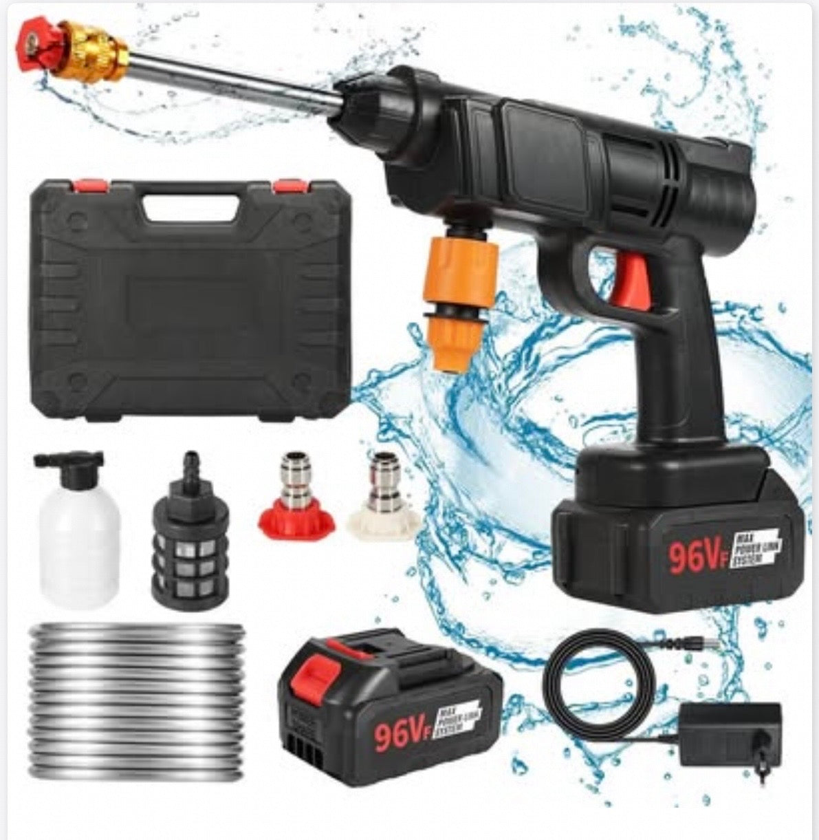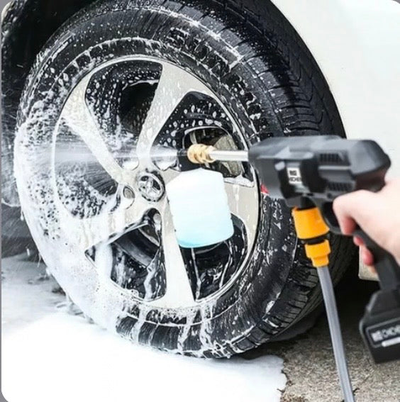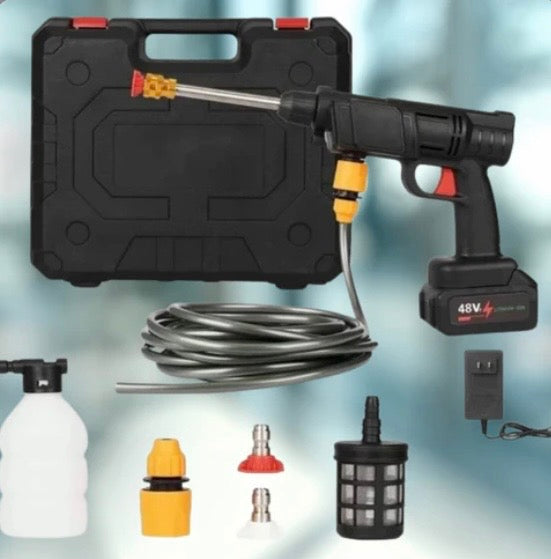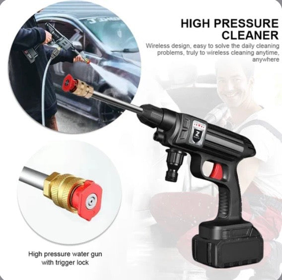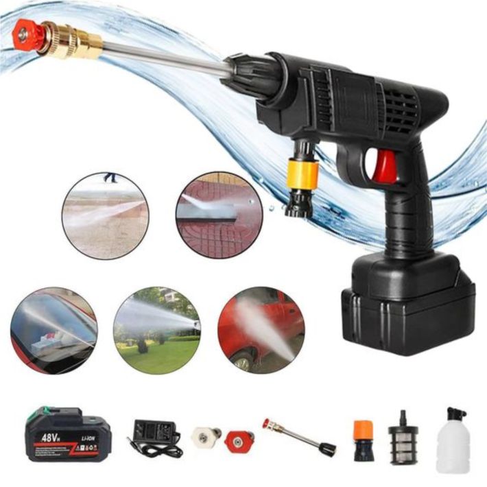 - Esta pistola lavado portátil inalámbrica de alta presión de autos brinda hasta 35 bar de presión, un flujo de agua nominal de 4 L/min y un rango de presión de agua de 6 a 12 m para una limpieza rápida de superficies exteriores del hogar, muebles de jardín, automóviles, escaleras y piscinas. Además, este producto utiliza una batería mejorada, que puede durar hasta 20-30 mins después de una carga completa, lo que facilita enormemente su trabajo de limpieza